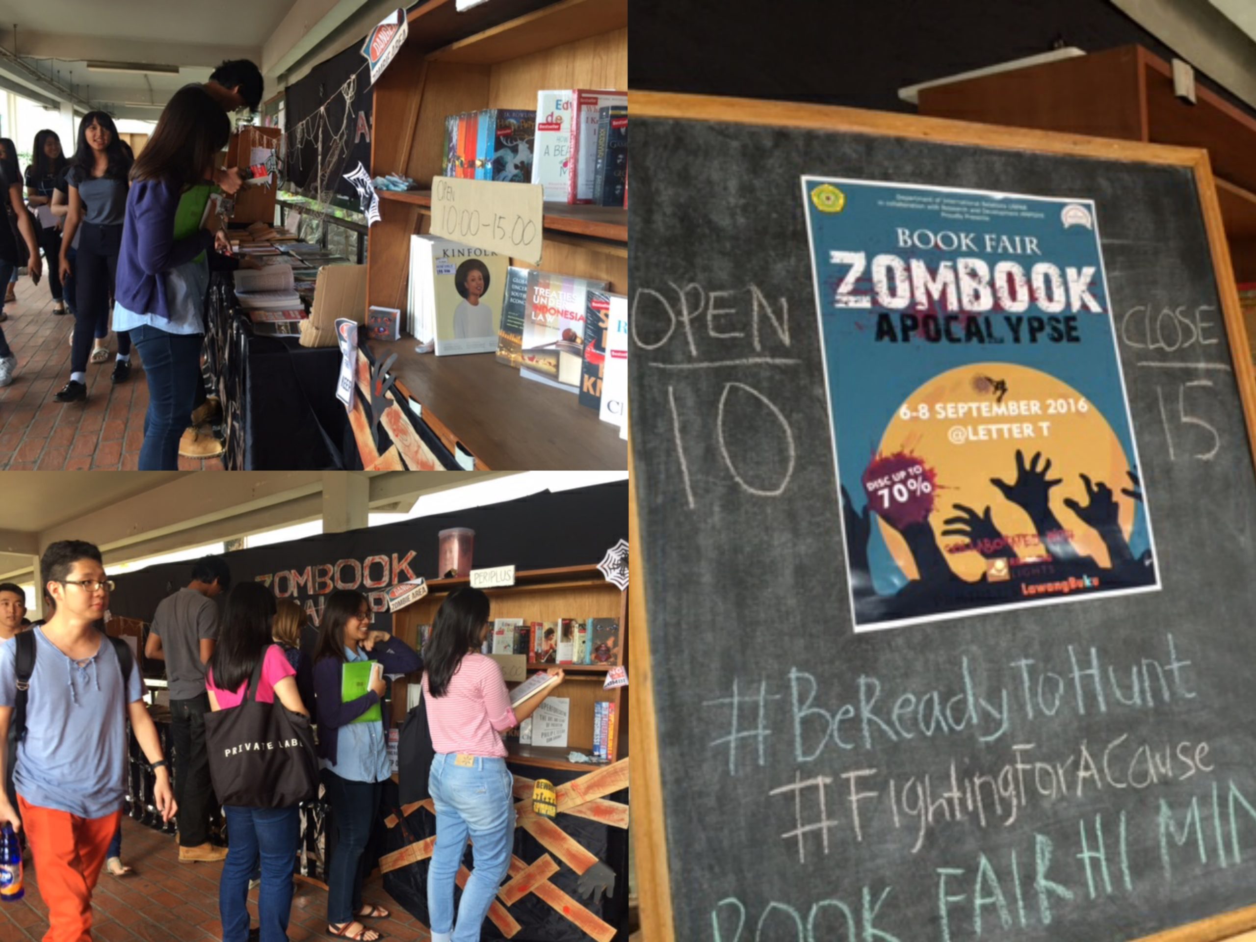 Bookfair merupakan salah satu program tahunan Divisi Penelitian dan Pengembangan (Litbang) Himpunan Mahasiswa Program Studi Ilmu Hubungan Internasional (HMPSIHI). Kegiatan ini dimaksudkan untuk menambah ketertarikan dan minat baca setiap mahasiswa di Program Studi Ilmu Hubungan Internasional UNPAR. Bookfair tahun ini diadakan pada 6-8 September 2016 di Taman FISIP dan mengambil tema “Zoombook Apocalypse“. Tema unik ini diambil dengan tujuan menggambarkan para mahasiswa yang datang mengunjungi bookfair sebagai zombie yang tertarik pada buku-buku yang digambarkan manusia. Selain itu, diharapkan dengan tema yang unik ini, ketertarikan mahasiswa untuk mengunjungi bookfair pun semakin meningkat. Bekerjasama dengan Periplus, Reading Lights, dan Lawang Buku, panitia Bookfair pun menawarkan potongan harga hingga 70%.