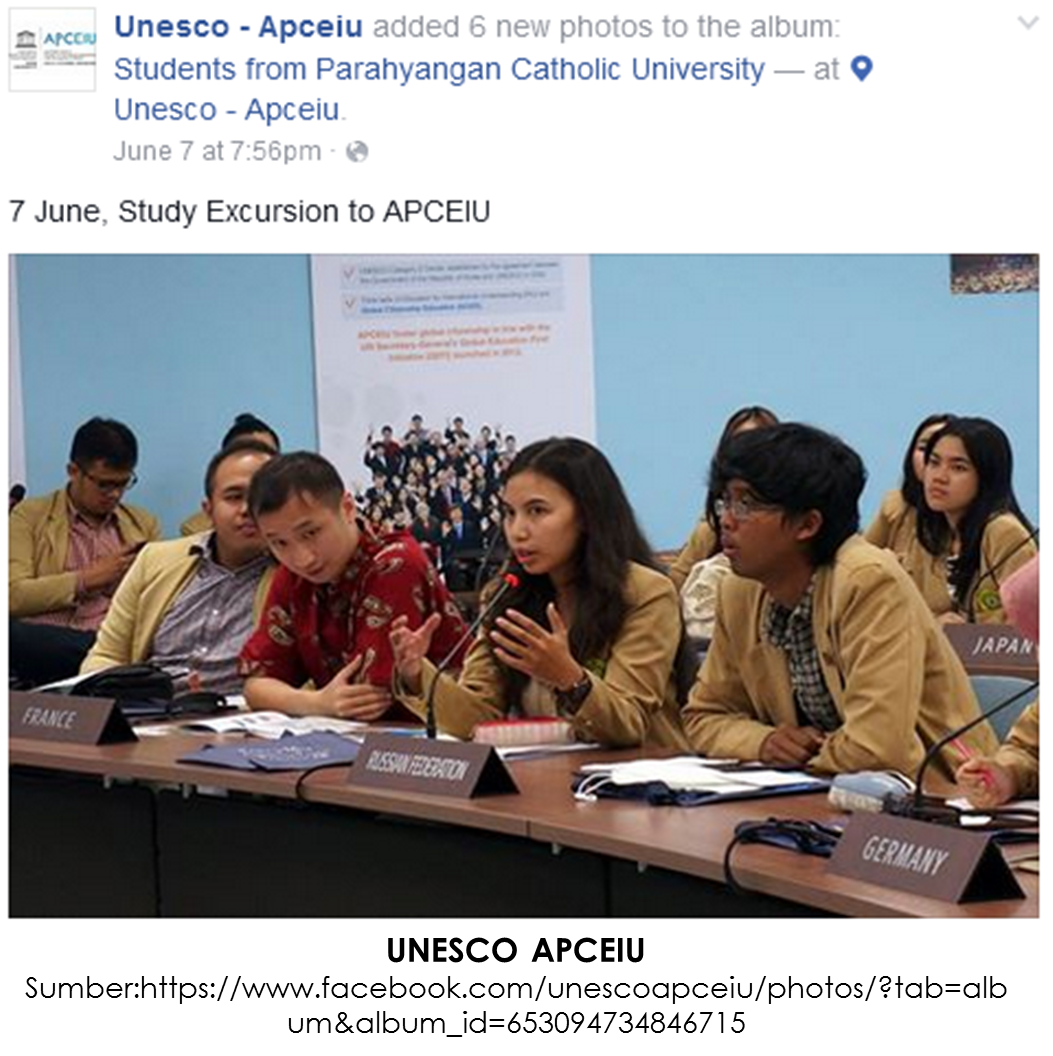 n mempererat kerjasama antara Prodi HI UNPAR dengan universitas dan institusi yang dikunjungi. Pada tahun ini, studi ekskursi berlangsung mulai 5-14 Juni 2016 dengan tujuan Korea Selatan. Mengambil tema, “The Soft Power of South Korea in International Area”, studi ekskursi ini diikuti oleh 39 mahasiswa dari berbagai angkatan (2013, 2014, dan 2015), serta didampingi oleh Albert Triwibowo, dosen Prodi HI UNPAR. Kunjungan resmi pertama dilaksanakan pada tanggal 6 Juni 2016, yaitu kunjungan ke UNESCO Asia Pacific Centre for International Understanding (UNESCO APCEIU), lalu dilanjutkan ke University of Seoul. Di UNESCO APCEIU, peserta studi ekskursi memperoleh pengetahuan akan pentingnya pendidikan untuk menciptakan perdamaian dunia, terutama yang berkaitan dengan international understanding bagi masyarakat dunia atau global citizens. Berbeda dengan kunjungan pertama, pada kunjungan kedua, dua perwakilan mahasiswa dari HI UNPAR, yaitu Inigo Abigail (201333000