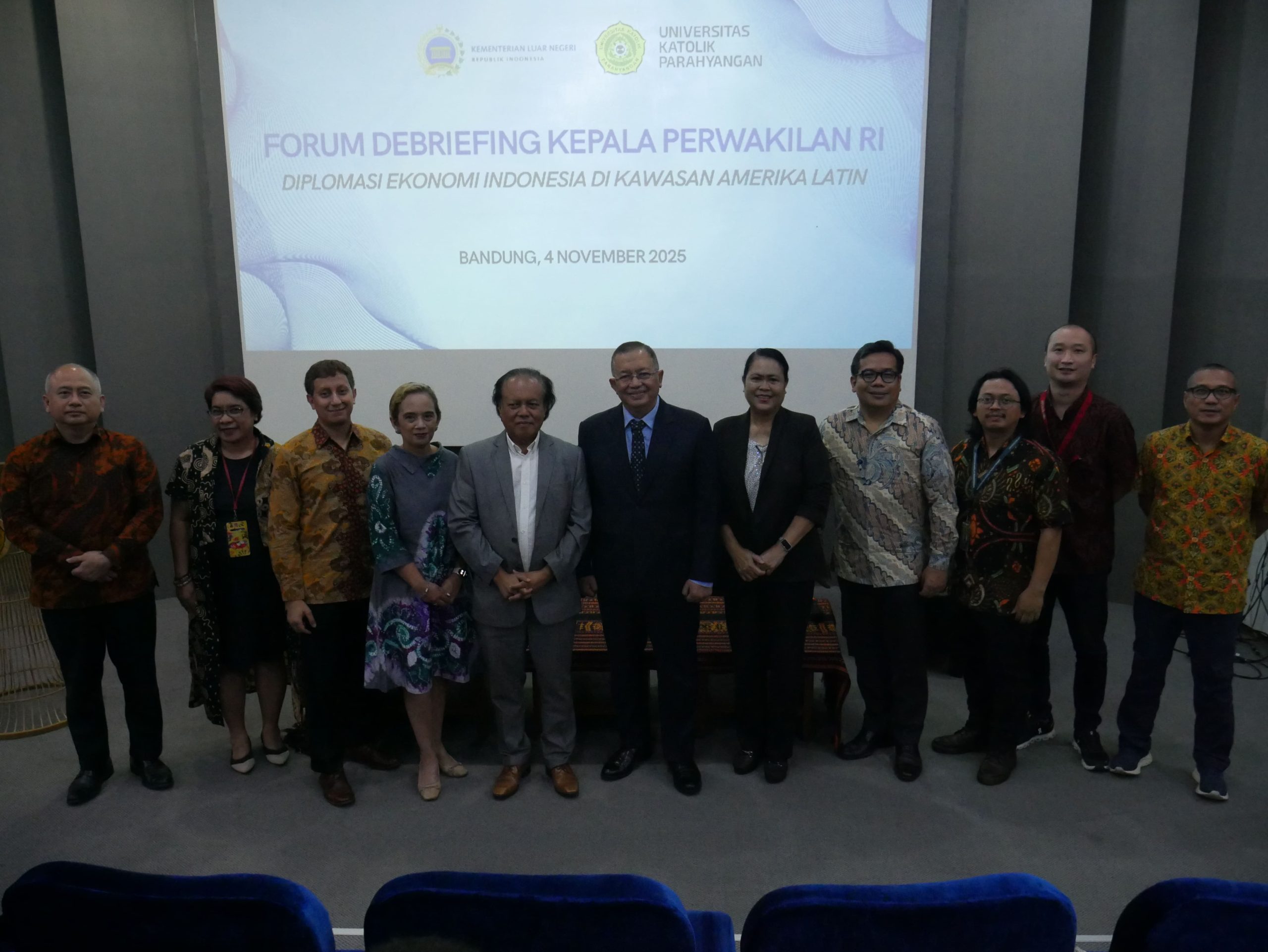 Bandung, 4 November 2025 – Badan Strategis Kementerian Luar Negeri (BSKLN) bekerja sama dengan Universitas Katolik Parahyangan menyelenggarakan Forum Debriefing Kepala Perwakilan RI, dengan tema “Diplomasi Ekonomi Indonesia di Kawasan Amerika Latin.” Forum ini berlangsung secara hybrid dari Ruang Audio Visual FISIP UNPAR dan Youtube BSKLN.