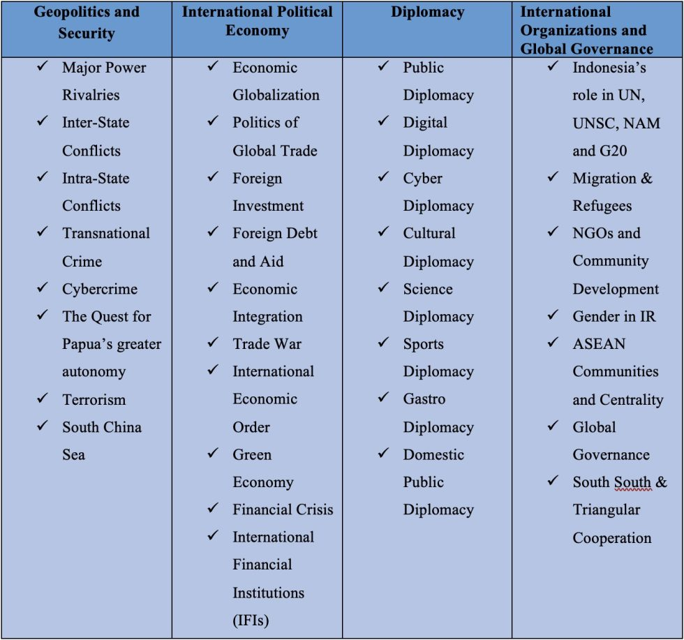 Bidang minat penelitian mencerminkan keahlian para dosen Jurusan Hubungan Internasional dan kepentingan mitra yang membutuhkan dukungan PACIS dalam menanggapi perkembangan terkini dalam politik dan ekonomi global. PACIS sangat bersyukur memiliki dosen-dosen yang memiliki komitmen kuat untuk mengembangkan keahlian mereka yang sangat relevan dengan isu-isu internasional terkini.